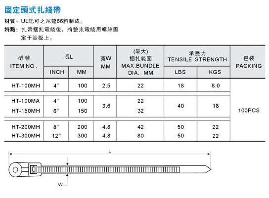 產品材質:尼龍扎帶采用UL認可尼龍66(Nylon 66)材料注塑制成,防火等級94V-2,具有良好的耐酸、腐蝕、絕緣性,不易老化、承受力強。操作溫度為-20℃到+80℃(普通尼龍66)。