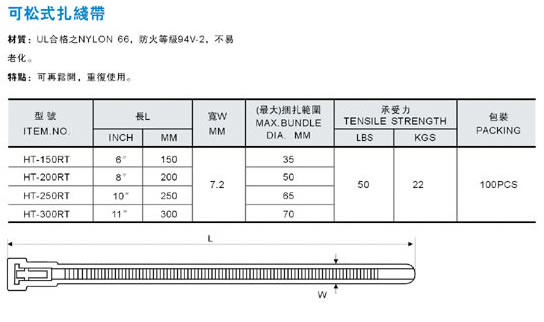 4、標牌式尼龍扎帶采用UL認可尼龍66料制成,防火等級94V-2,耐酸蝕,不易老化。 特點:扎帶前端設有空白標牌,可用油性筆在上面標志記號。
